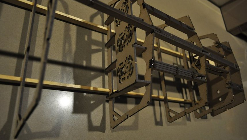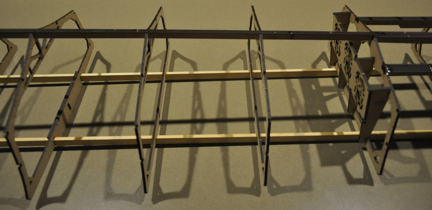 This kit includes ribs, transom, laminated main keel, laminated wing prop shafts and separate rudder keels, triple motor mount, servo mount, a large battery box and a stand, 76 parts in all.