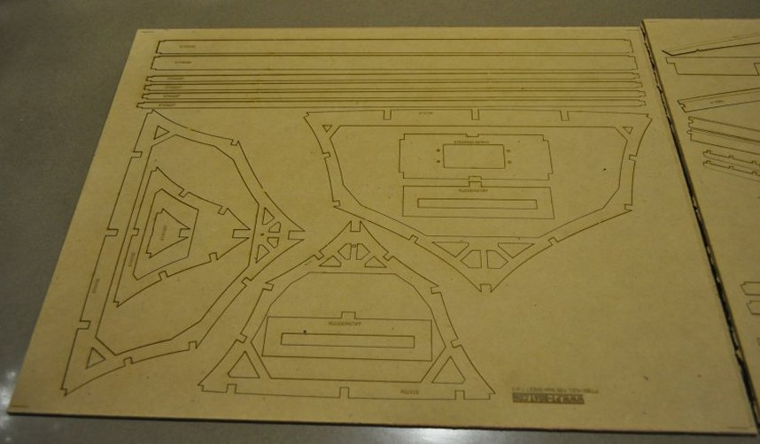 For every shipment of marine ply that I buy, I also buy a couple of sheets of 3mm MDF as protection during shipment. The sheets of ply are about $80 - $100 Australian Dollars whereas the MDF sheets are only $5.00 so I have been making lots of models such as scale model houses and experimental stuff from the MDF sheets and it cuts both quicker and cleaner than marine ply and also etches very well so I thought I would introduce a lower cost kit for those that can't afford the cost or complexity of the Hull-2 marine ply version. Much of the cost of kits is postage however as most of my customers are around the other side of the planet, I can't do much about that but if I can knock off some cutting time and $70 worth of material that is a good thing.