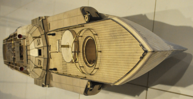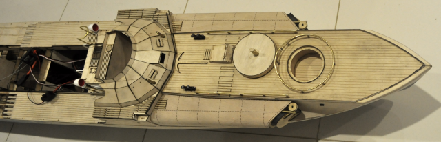 This shows the two main holes in the foredeck, the smaller left hole is for the forward gun tub and the larger right hole is covered by the removable gun cover and conveniently gives access to the torpedo door servo.